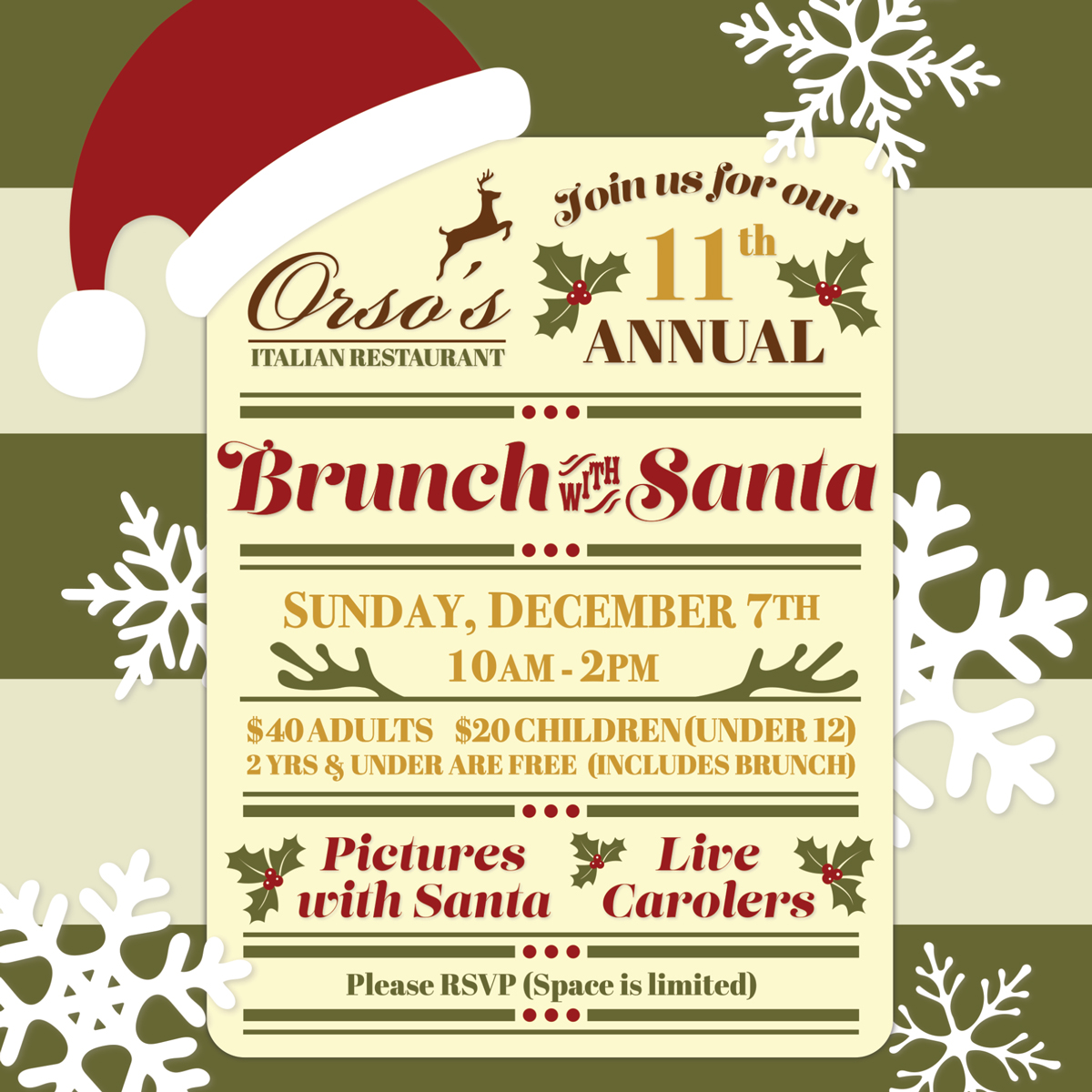 Join us for our Annual Brunch with Santa * Sunday, December 7th from 10am-2pm Pictures with Santa, plated brunch menu, holiday music, carolers and lots of Christmas cheer!